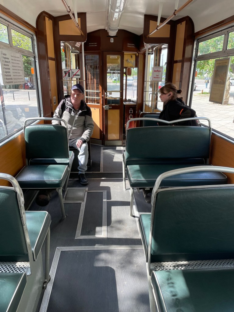Eine alte Straßenbahn, die von einer Bürgerinitiative wieder hergerichtet wurde und ganz normal im ÖPNV verkehrt.