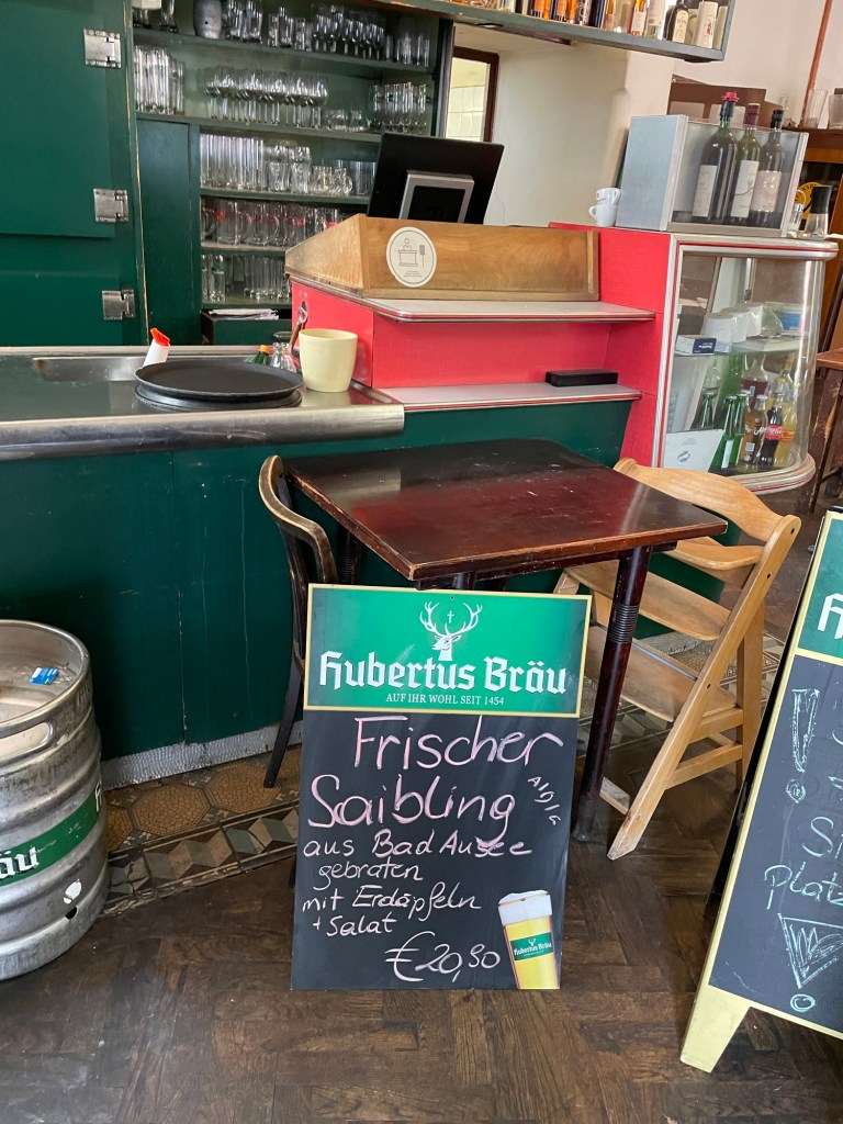 Was den Kellner angeht, finde ich nicht die richtigen Worte. „Autoritär“ trifft es nicht. Er ist freundlich und lacht, wenn er uns kommen sieht. Wir stehen mit tropfendem Schirm und bangem Herzen vor der Platziertafel. „Der Schirm bleibt hier“, schnauzt er unvermittelt los und wir müssen den Schirm auf den leeren Bierfässern ablegen. Dann werden wir aber zu einem schönen Fensterplatz geleitet und er nimmt das „Reserviert“ Schild weg.