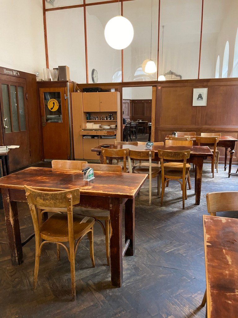 Die Holzverkleidung mit Garderobenhaken und die alten Tische mit Resopalplatte.