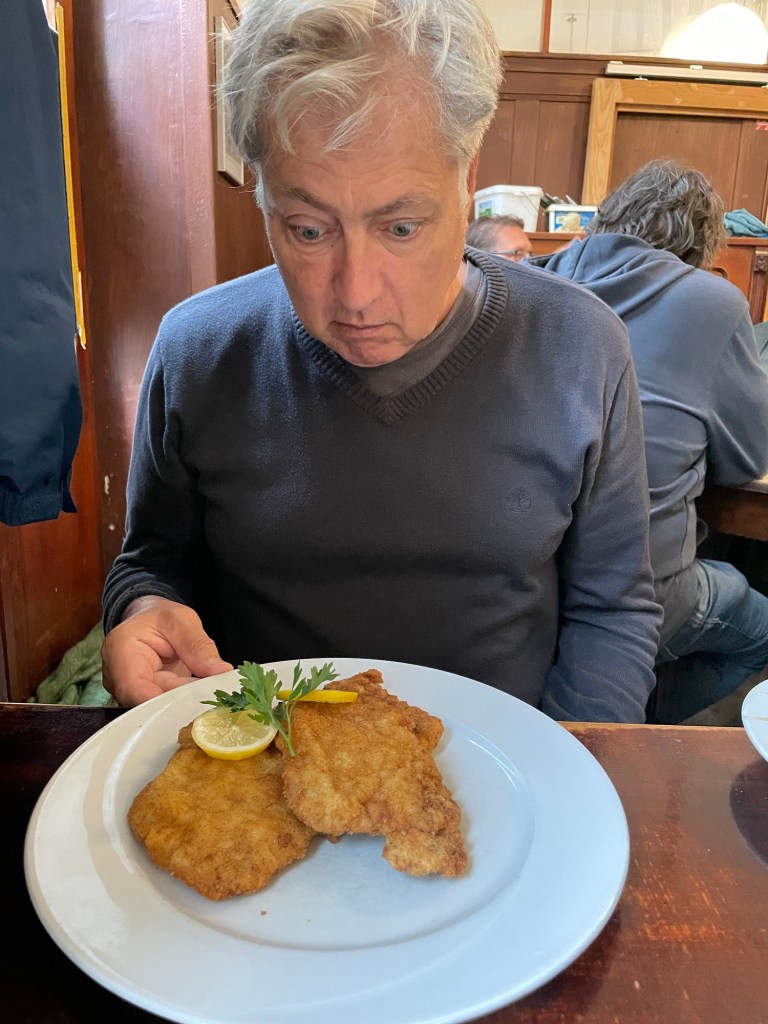 Genau wie Rüdigers Schnitzel. Endlich mal eins, das richtig kross war. Sein Entsetzen gilt der Menge. Es waren 3 Stück und ein Riesenteller Salat.
