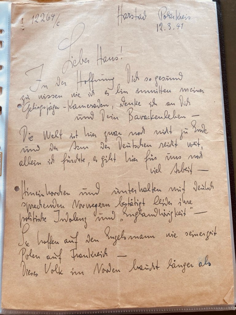An einen Brief von einem gewissen Ernst Kretschmann habe ich mich jetzt erinnert, denn er wurde 1941 in Harstad geschrieben. Genau da, wo ich jetzt bin.