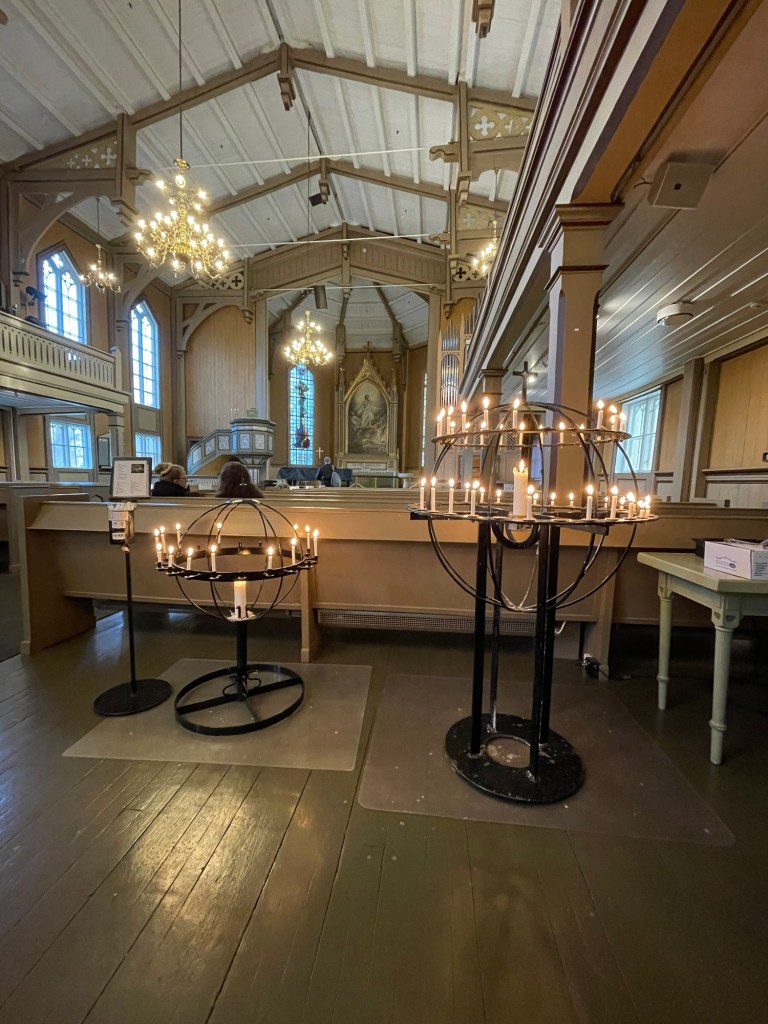 Die nördlichste evangelische Kirche der Welt ist als einzige Kirche Norwegens ganz aus Kiefernholz gebaut.