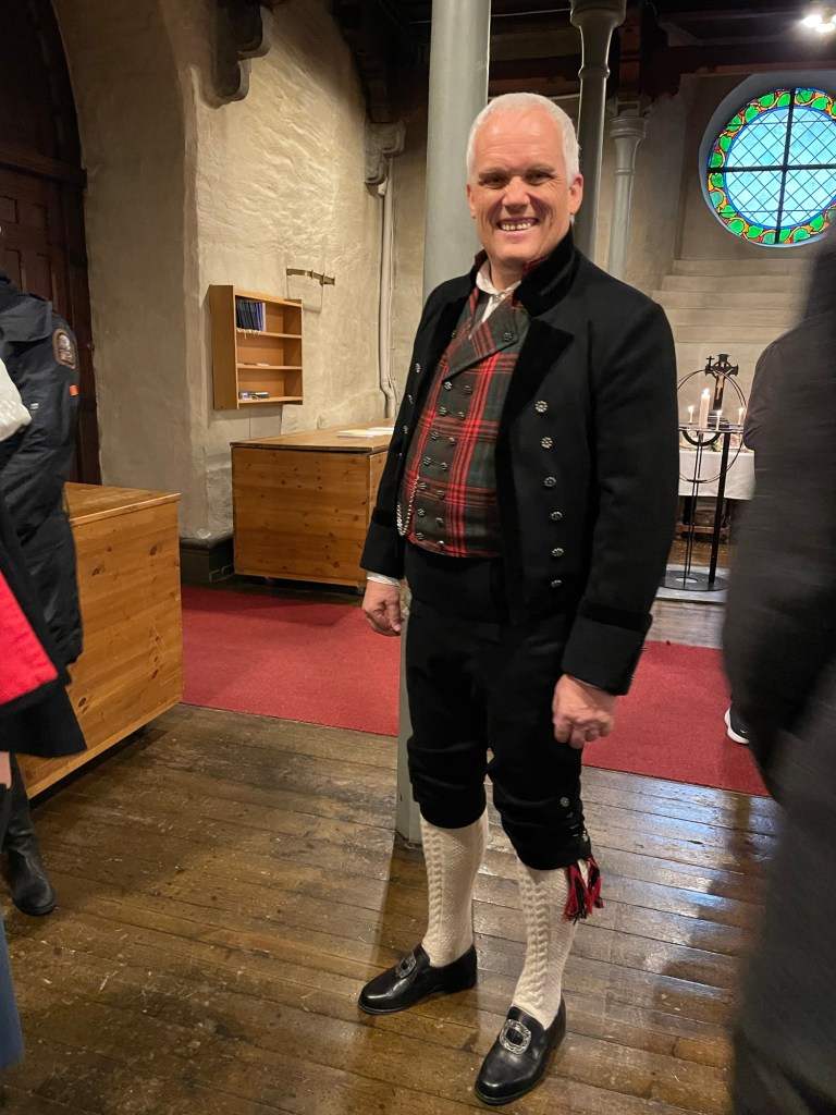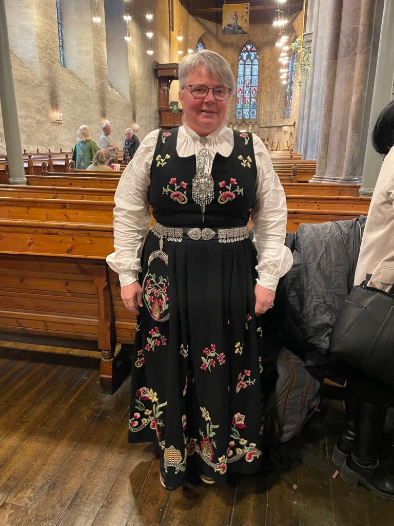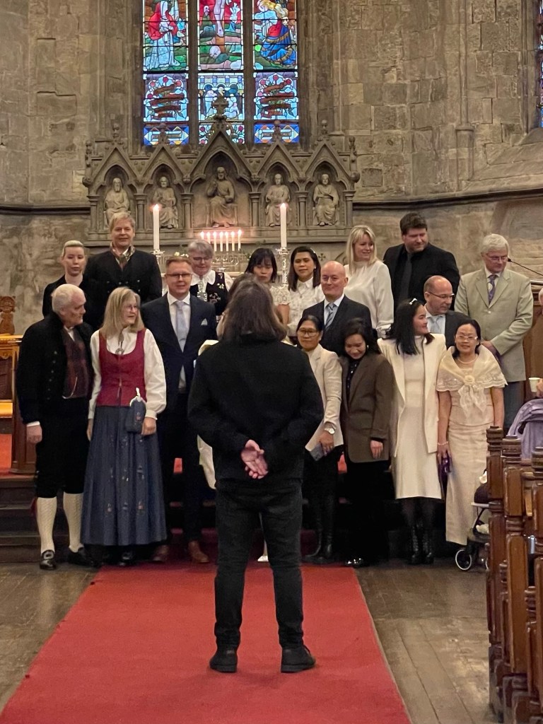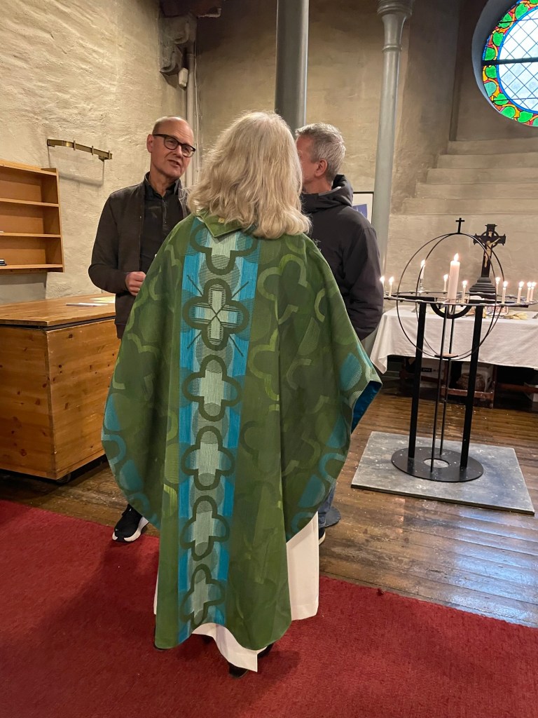 Die Männer in petrolfarbenen, bodenlangen Kutten mit einem goldenen Blumensymbol auf der Brust könnten Mitglieder einer speziellen kirchlichen Bruderschaft oder einer liturgischen Gruppe sein, die im Rahmen bestimmter Gottesdienste oder Zeremonien besondere Aufgaben übernehmen. Solche Gruppen gibt es in manchen lutherischen Gemeinden, insbesondere in historischen Kirchen wie der Bergen Domkirke, die alte Traditionen pflegen.