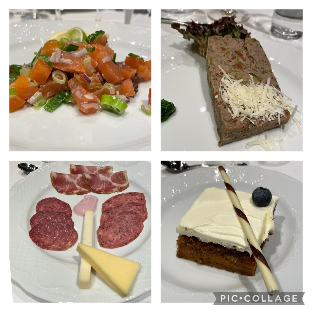 Daneben Hirschpastete. Die Salami war auch vom Hirschen und der Käse soll angeblich auf einer Weltmeisterschaft die Bronzemedaille gewonnen haben und ganz Norwegen auf den ersten Platz gekommen sein. Schon zum zweiten Mal in Folge. Daneben Möhrenkuchen unprämiert.