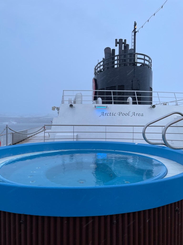 Es gibt tatsächlich Leute, die gehen mit Mütze und Badeanzug in so einen beheizten Pool. Was für eine Energieverschwendung.