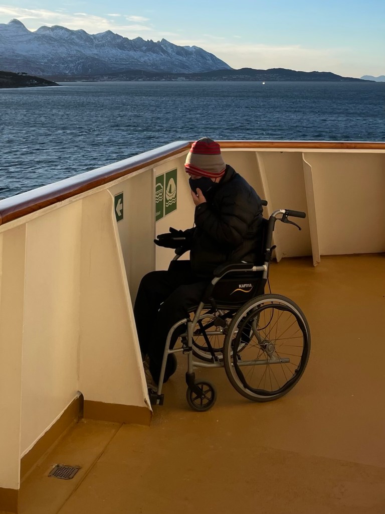Lachen musste ich auch hier. Nicht über den Mann, aber über die Marke seines Rollstuhls. Ich habe zweimal hingeschaut, aber da steht tatsächlich „Karma“.