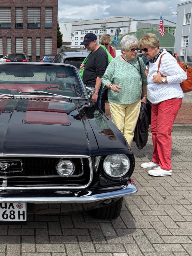 Die Dame scheint auch von ihren Erfahrungen im Mustang zu erzählen.