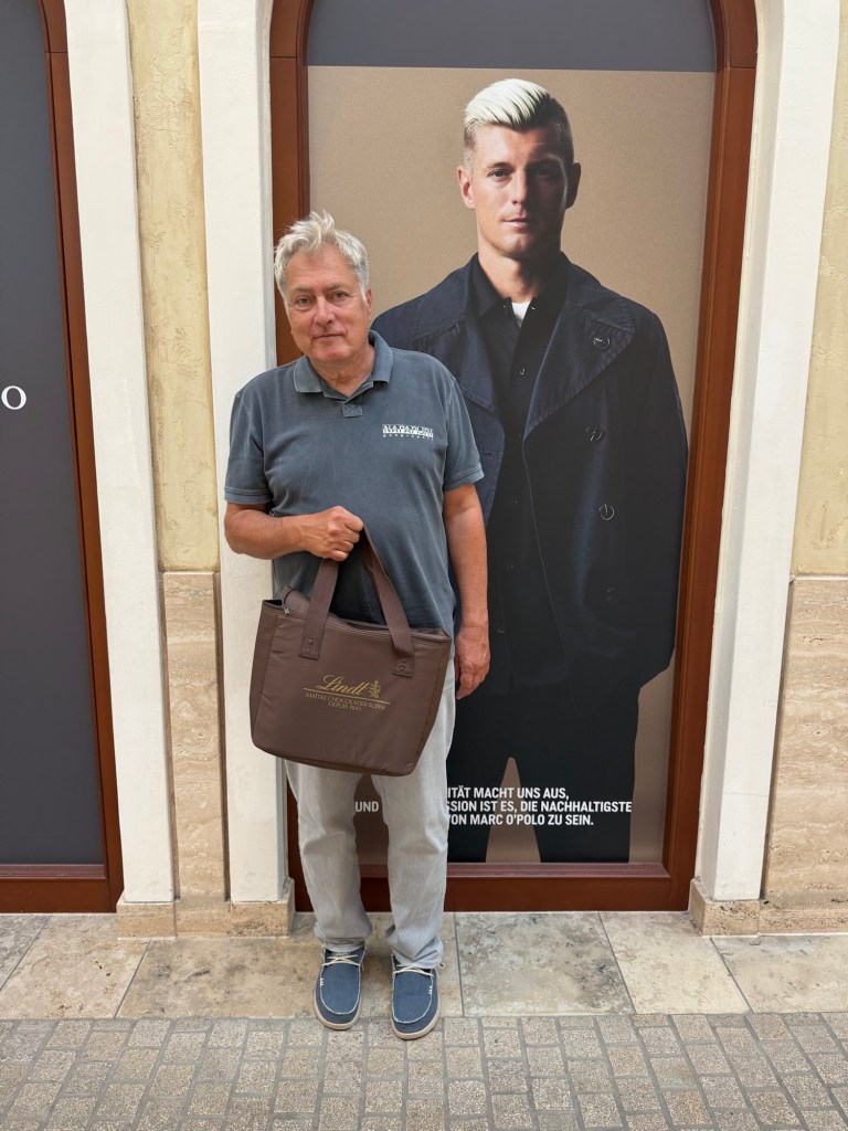 Dieser Mann, der hier stolz eine wohlgefüllte Kühltasche aus dem Lindt Outlet präsentiert, ist heute 69 Jahre alt geworden.