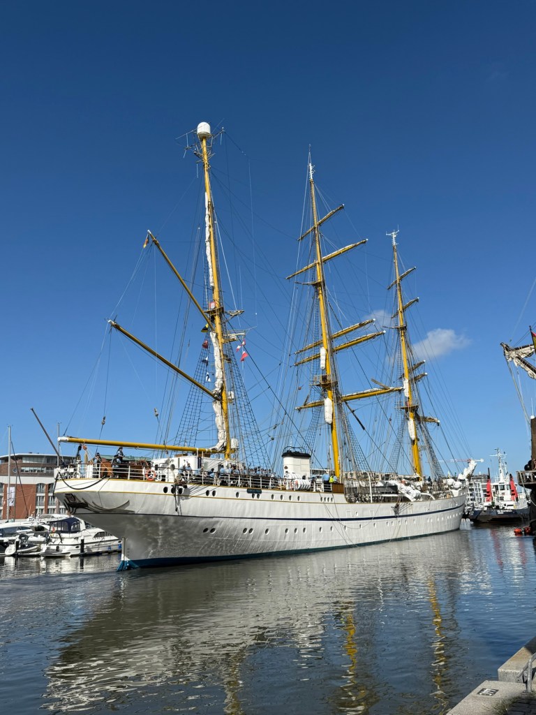 Mit zwei Schleppern wird die Gorch Fock aus dem Hafen bugsiert.