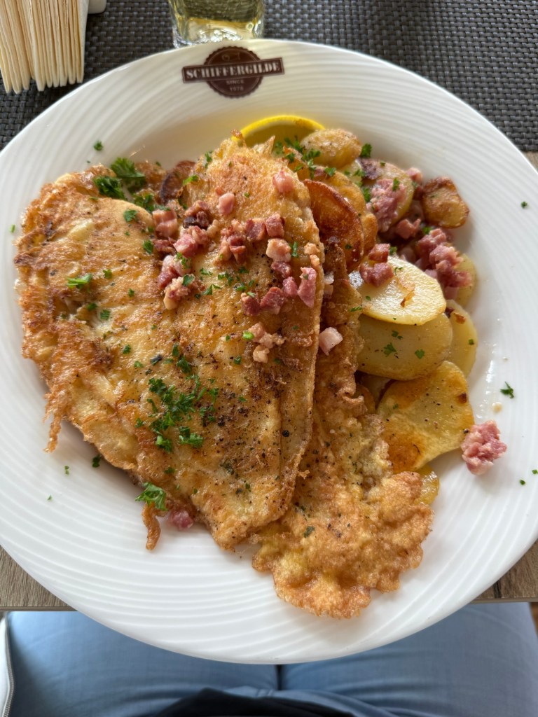 Bratfisch mit Bratkartoffeln oder Kartoffelsalat.
