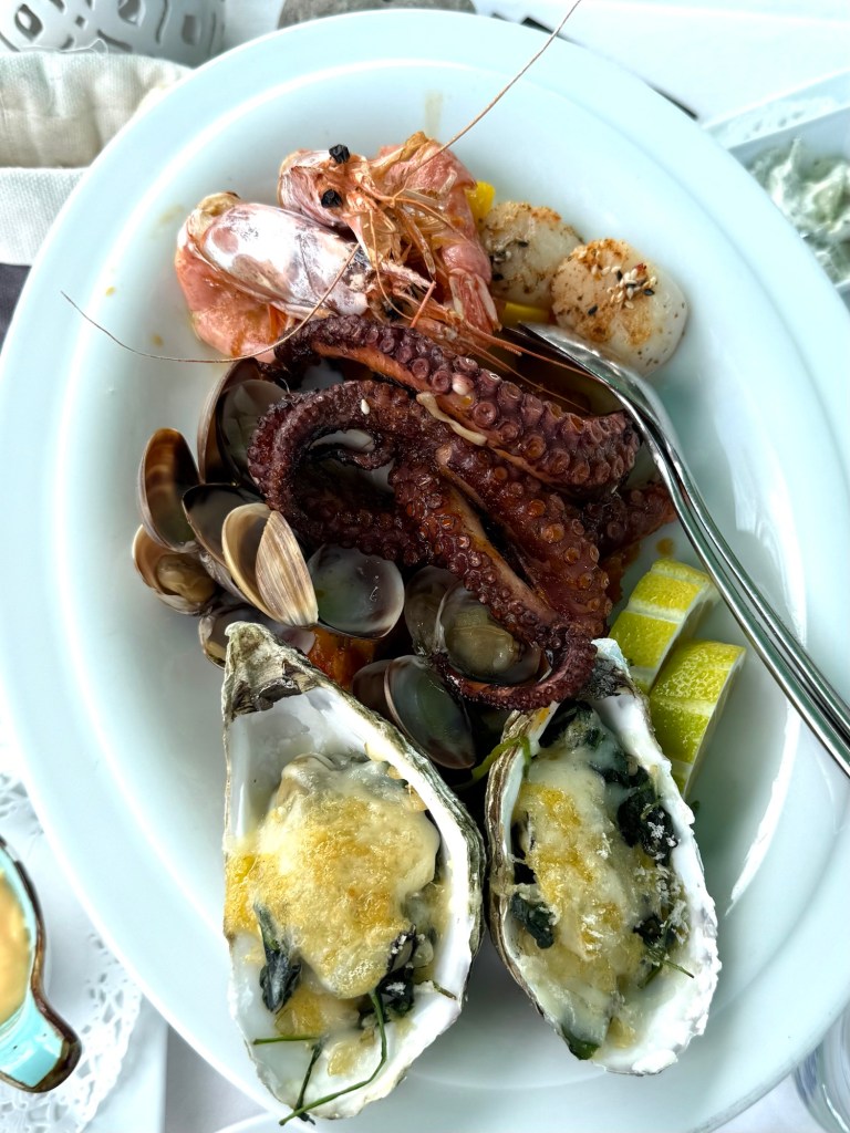 Sie besteht aus überbackenen Austern mit Spinat, in Knoblauch gedämpften Muscheln, Gambas, gebratenen Pulpoarmen und Jakobsmuscheln mit Sesamkruste.