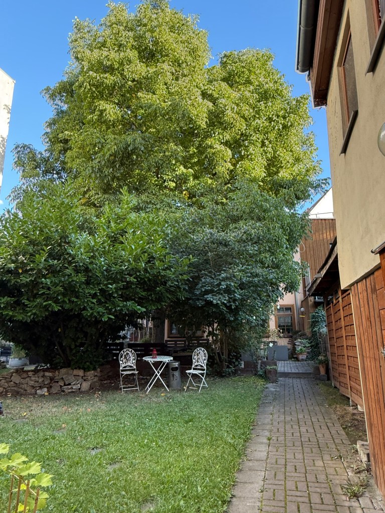 Hinter den Stühlen und dem Walnussbaum wohne ich in einer riesigen Ferienwohnung im Hinterhaus. Sehr schön und ruhig.