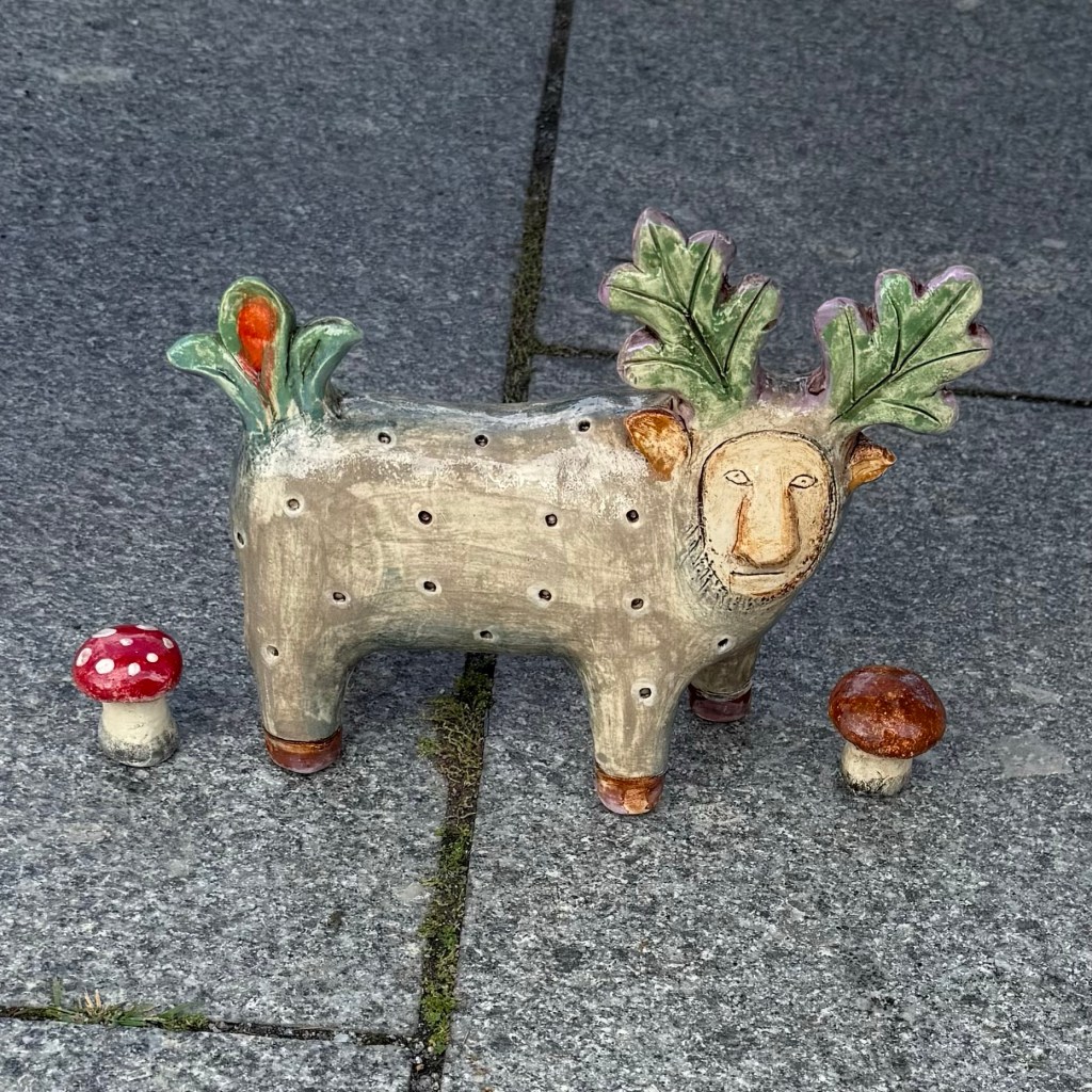 Eine gepunktete Kuh mit einem bärtigen Männergesicht und Eichenlaubgeweih.