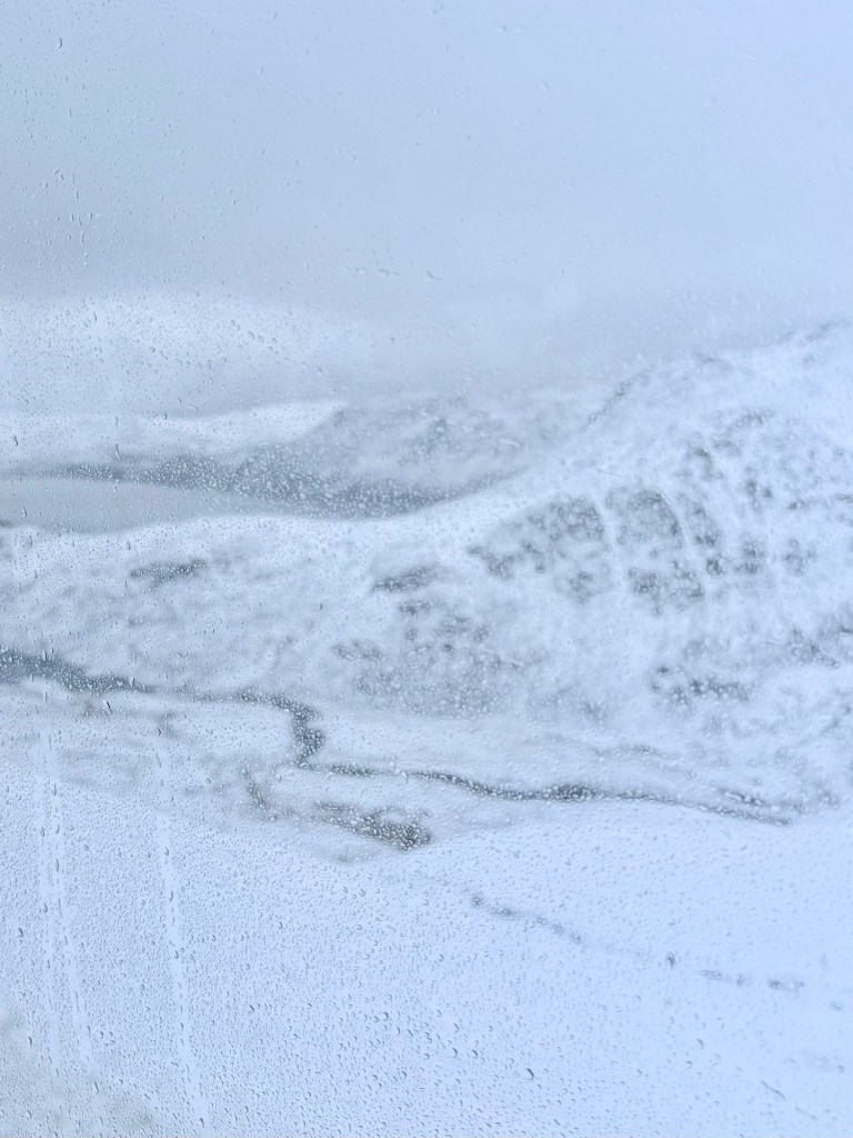 Der Regen auf der Scheibe verwischt die Konturen der verschneiten Granitfelsen.