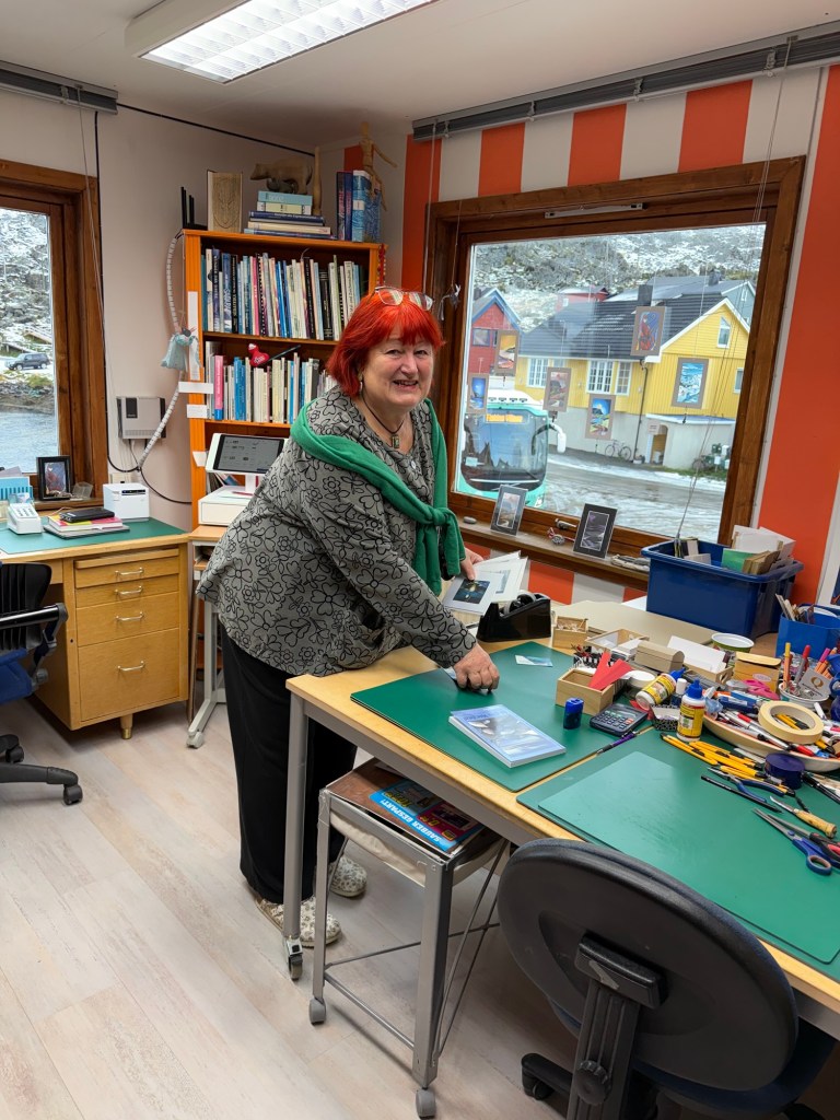 Sie collagiert Fotos der Landschaft aus Altpapier und schreibt auch Bücher.