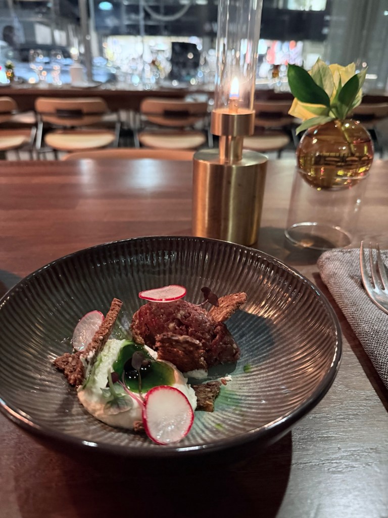 Rentiertartar mit Sourcream und Pumpernickelcroutons.